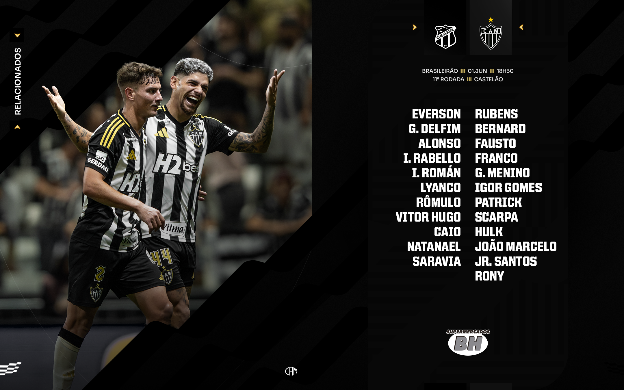 O Atlético-MG está escalado para a partida de logo mais contra o Ceará. Cuca manda uma equipe diferente, com três zagueiros. Além disso, Hulk começa a partida no banco de reservas.
