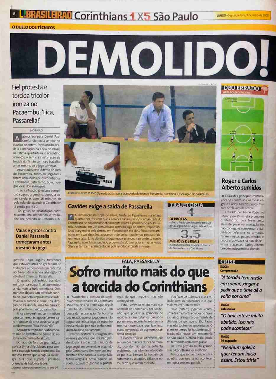 Há exatos 15 anos, em 8 de maio de 2005, Dia das Mães, o São Paulo goleou o Corinthians por 5 a 1 no Pacaembu. A manchete do L! no dia seguinte fazia alusão aos "Galácticos" do Parque São Jorge, atropelados pelos "Goleáticos" do Morumbi.