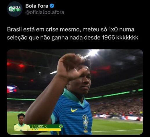 Na estreia de Dorival Júnior à frente da Seleção Brasileira, Endrick entrou no segundo tempo e fez o gol da vitória do Brasil no Estádio de Wembley. Nas redes sociais, não faltaram brincadeiras enaltecendo o jovem jogador do Palmeiras, além de montagens com os zagueiros Fabrício Bruno e Beraldo. Veja a seguir! (Por Humor Esportivo)